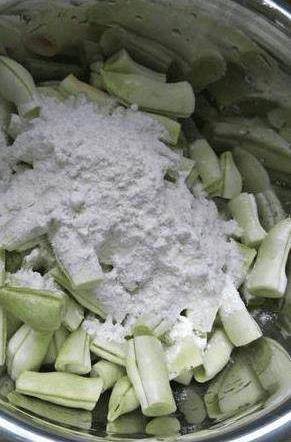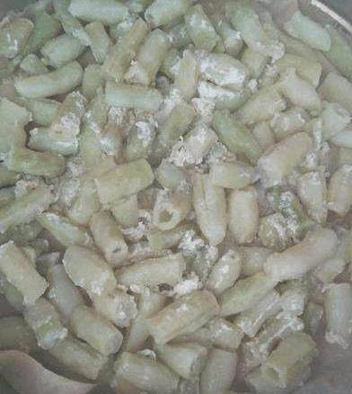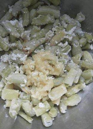 7、拌勻,豆角上都裹上面粉就可以瞭。