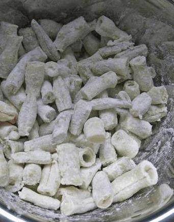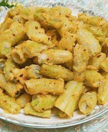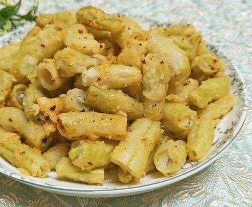 老豆角300克、面粉、大蒜、香油、鹽、適量。