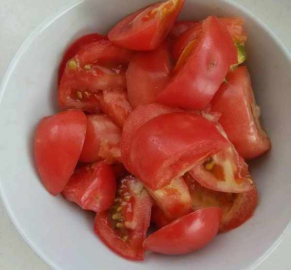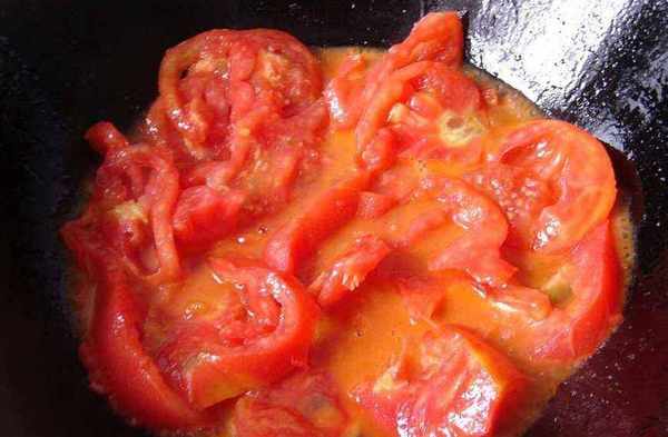 (4)鍋熱倒油、爆香蔥白後放入番茄;