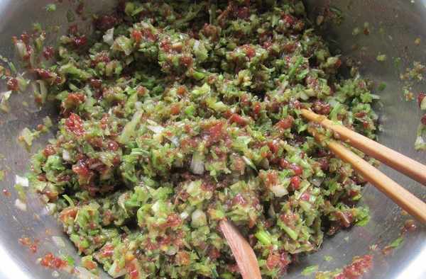 4,把切菜剁細加入到牛肉餡裡拌勻。
