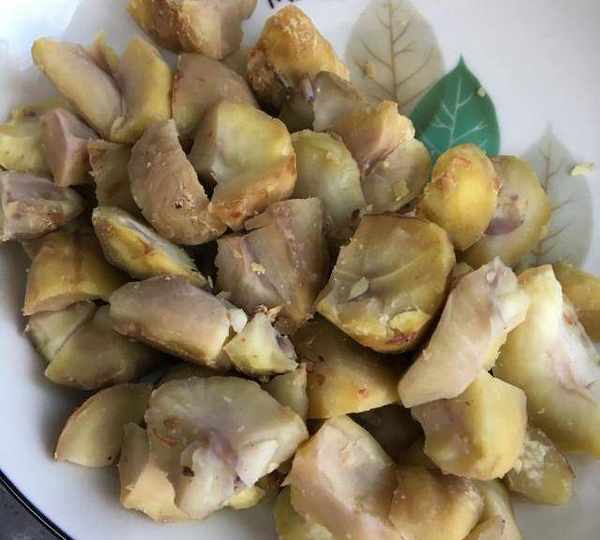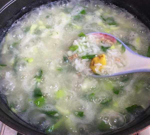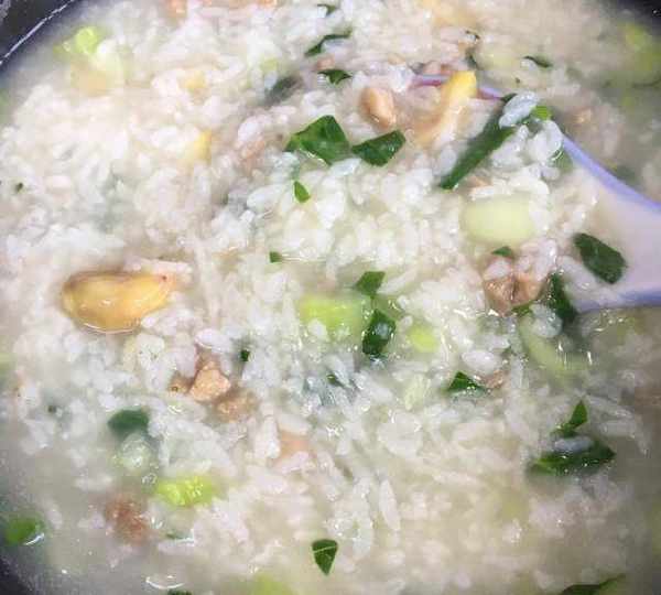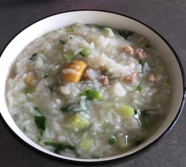 原料:肉末、板栗、大米、青菜、淀粉、稻米油、鹽、胡椒粉、生抽。