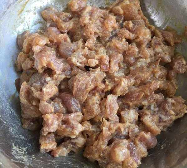 第2步、瘦肉洗凈切成小丁,加入適量鹽,胡椒粉,生抽,淀粉,食用油拌勻醃制十分鐘。