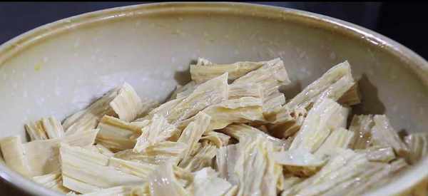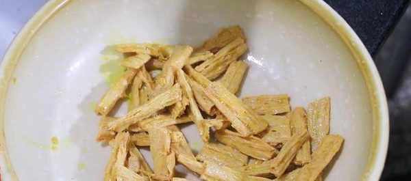 3.起鍋熱油,油熱至六成後,把腐竹倒進鍋裡炸一下,炸至金黃色之後撈出來備用。