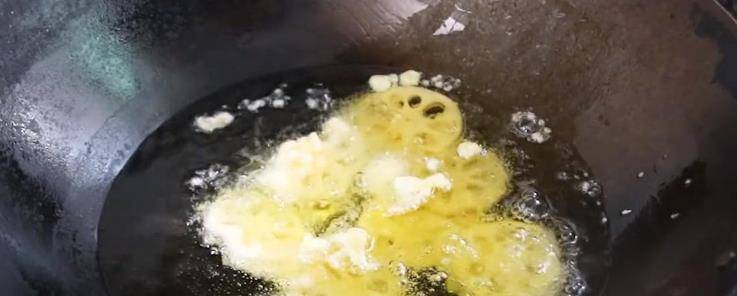 3.起鍋熱油,油溫至六成後,用筷子把蓮藕夾進面粉雞蛋液裡過一圈,接著放進油鍋裡炸,等藕片都炸成金黃色以後,撈出來放進碗裡備用。