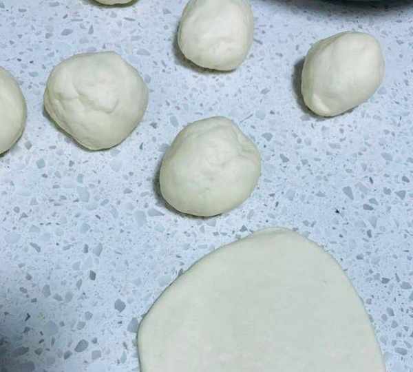 第11步、把面團分成均勻劑子,用搟面杖壓扁。