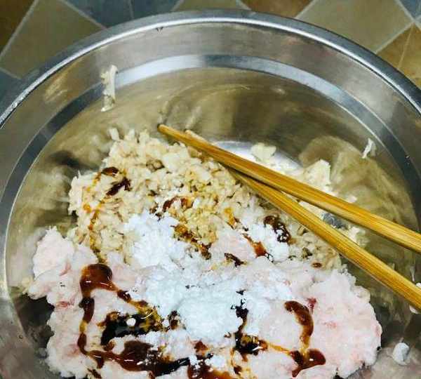 第9步、百合、豬肉、醬油、蠔油、淀粉加適量鹽調味。