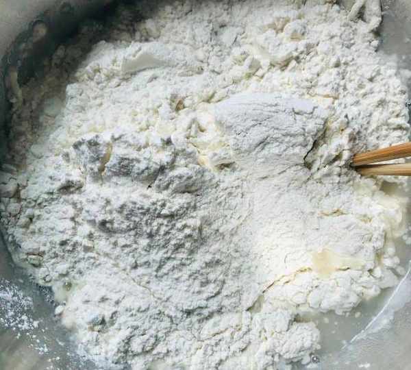 第2步、倒入面粉,用筷子攪拌。