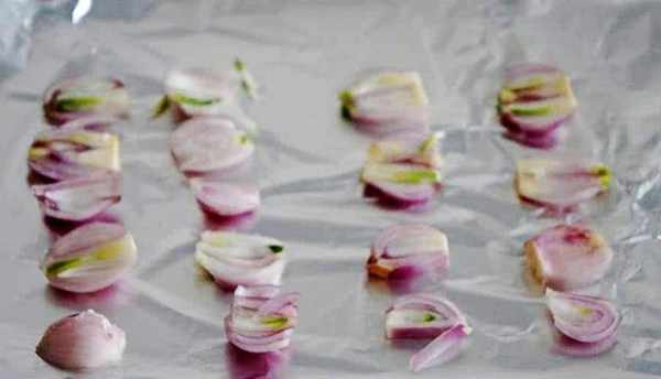 烤盤內鋪好錫紙,並擺上切成條塊狀的蔥,防止牛肉沾在錫紙上不好取。