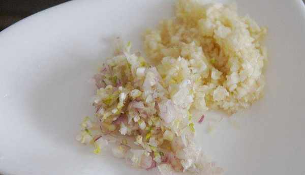 把蔥去皮後清洗幹凈後切成細末,蒜去皮後清洗幹凈同樣切成細末。