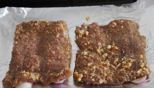 仔細地擺放上醃好的牛排,讓肉不要粘在錫紙上。