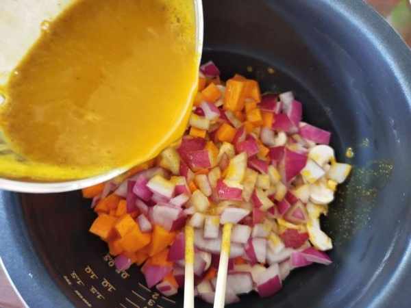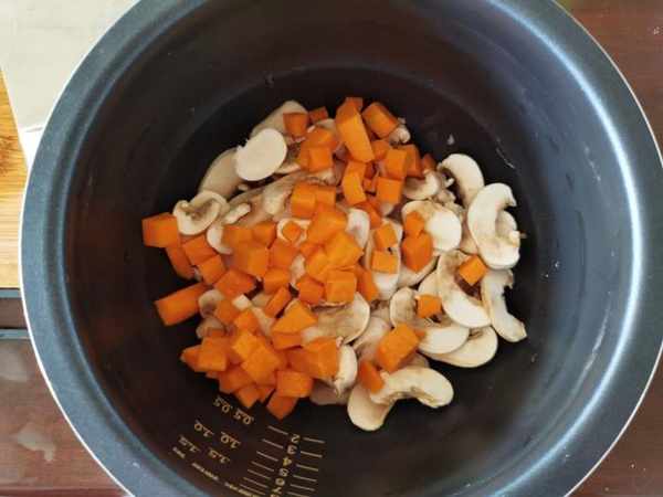 再把胡蘿蔔洗淨切成小丁一起放入到鍋裏。