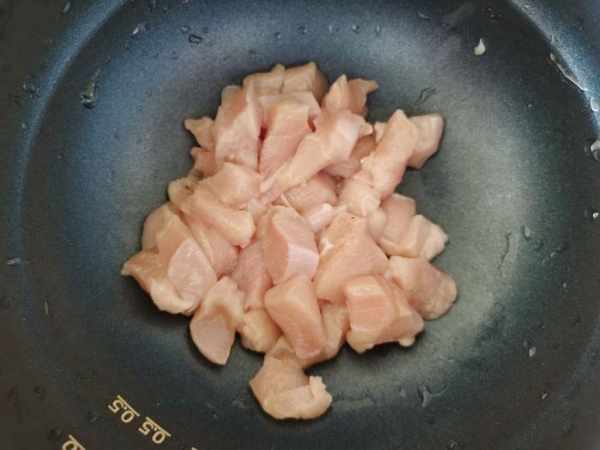 雞胸肉是脂肪含量很低的一種食材,100g的去皮(生)雞胸肉,熱量為105大卡。而在雞肉當中含有大量的鐵元素,可以幫助身體正常、高效的運轉,提高身體代謝水准。雞胸肉具有很强的飽腹感,中午吃一頓雞胸肉可以保持三個小時的飽腹感。這樣有利於减少中間攝入其他的食物,以免再長胖。我們先把雞胸肉切成小丁放到鍋裏。