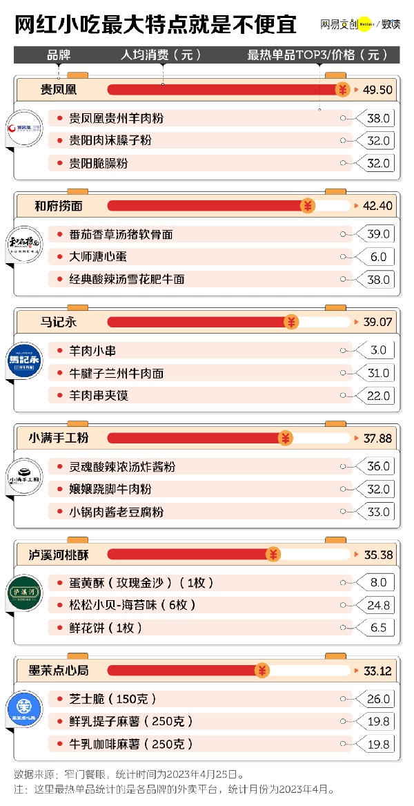 除瞭融資受阻,受疫情的影響,在消費降級的大環境下,網紅小吃們高定價也顯得非常尷尬。與傳統的街頭小吃不同,網紅品牌們創立時就定位走高端路線,一碗小面賣三四十元、一份麻辣燙賣四十五元。