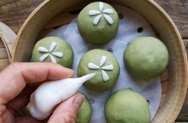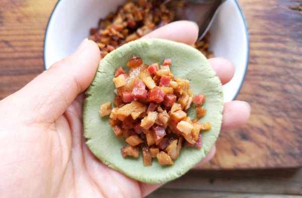 步驟七:綠色的面團分成大小均等的面劑子,搟成餅狀,然後包裹肉餡,要緊密地包裹起來,最後在上面用白色的面團做出水滴狀。