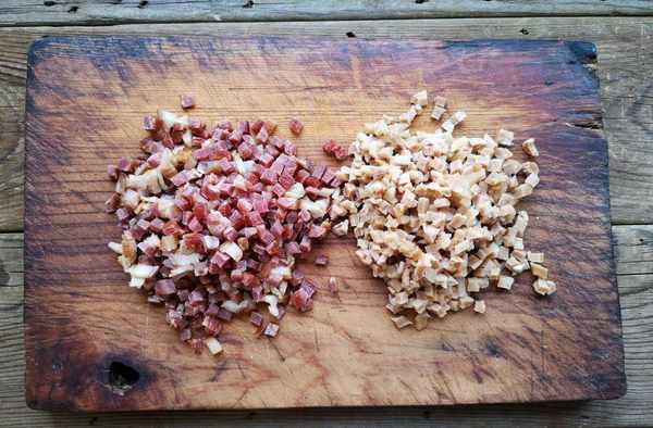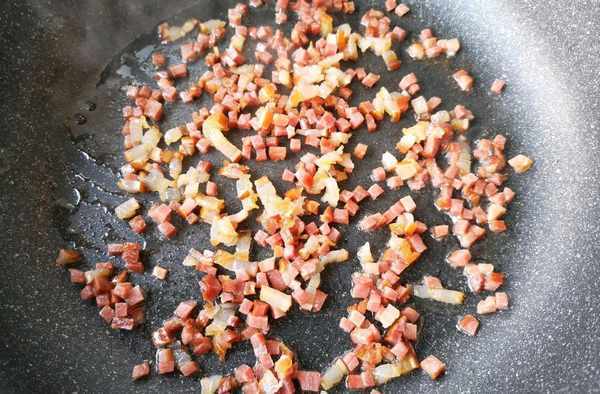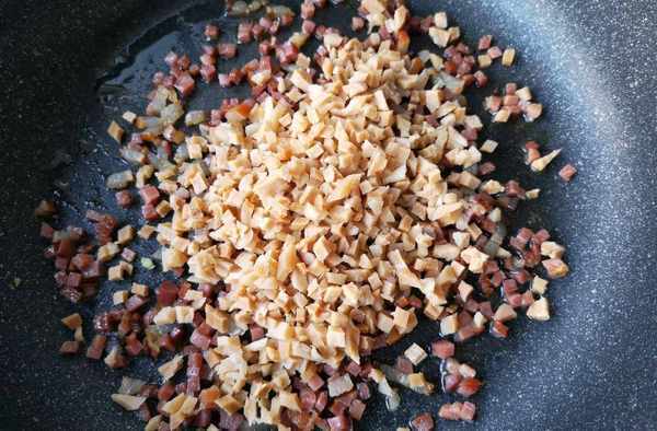 步驟二:浸泡好的筍幹控幹水分,然後切成小丁,臘肉也是要切成小丁備用,臘肉如果是自己醃制的,那麼還要先沖洗幹凈然後蒸熟才能夠使用,可以直接買超市中處理好的臘肉。起鍋燒油,油不需要太多,油熱之後放切好的筍幹、臘肉一起煸炒,不要用大火。