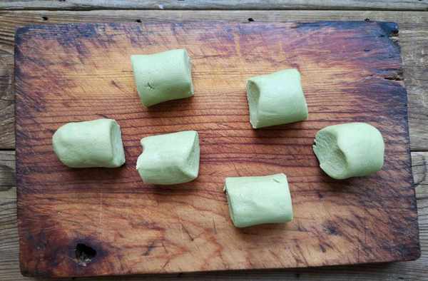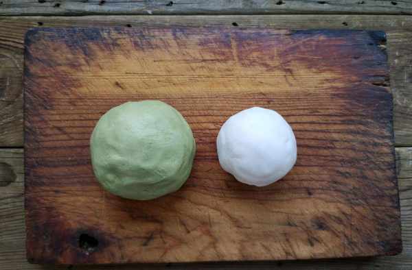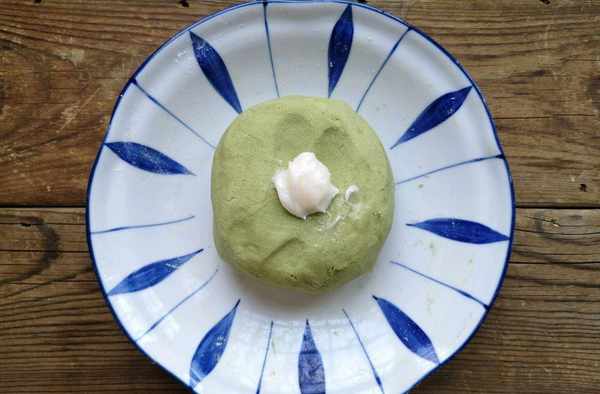 步驟六:做好的面團是綠色的,這種面團就是包裹肉餡的,另外再不放艾草汁揉出來一個白色的面團。