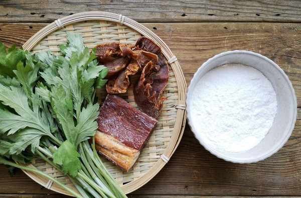 配料:糯米粉125克,粘米粉35克,澄粉20克,開水20克,艾草1把,溫水100克,臘肉一塊,筍幹50克,熟豬油5克,味極鮮醬油1勺。