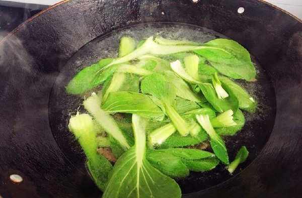 6,我用的小白菜比較大片,所以我提前加入瞭白菜,如果是比較小片的嫩白菜葉,建議起鍋之前加。