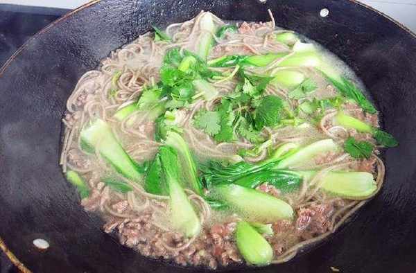 蕎麥面200克,新鮮牛肉100克,薑末少許,小白菜幾片,香菜少許,紅薯淀粉適量,鹽適量,清水適量,油少許,料酒少許,蠔油少許。