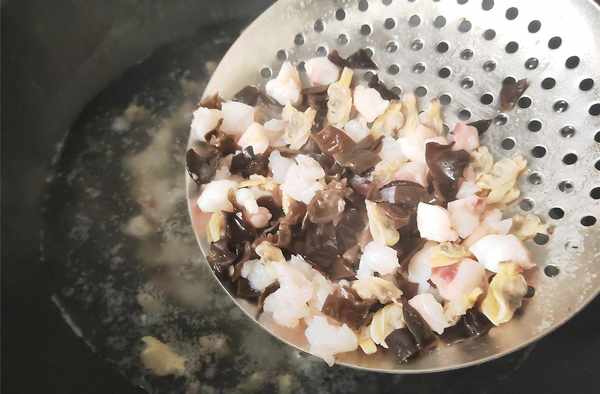 6.煮粥期間,另起一鍋,加入水燒開,下入蝦仁、章魚足、花蜆子肉,木耳一起焯水,去除異味,水開後,將食材一起撈出,瀝凈水分待用。