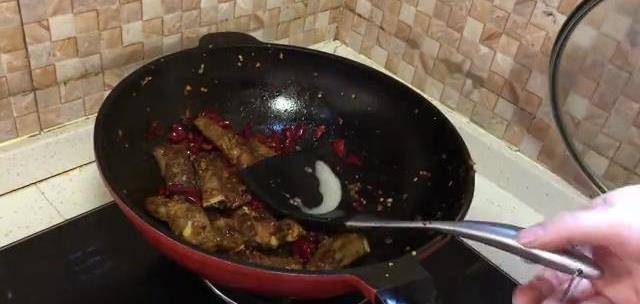 燜煮幾分鐘,待水分微幹,加入孜然粉或者辣椒粉,再放幾滴辣椒油。最後倒一點淀粉水,能夠讓排骨滲出的湯汁更香更抽,幾滴就足夠瞭。