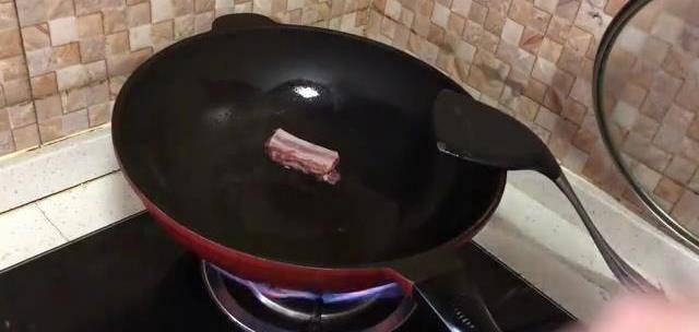 接下來我們在鍋裡倒油,沾滿鍋底後輕輕抬起鍋把,讓鍋底剩餘的油滑向四周。期間稍稍轉動過,讓鍋裡的油能夠均勻受熱,一直到油溫八成熱的時候把排骨放進來。