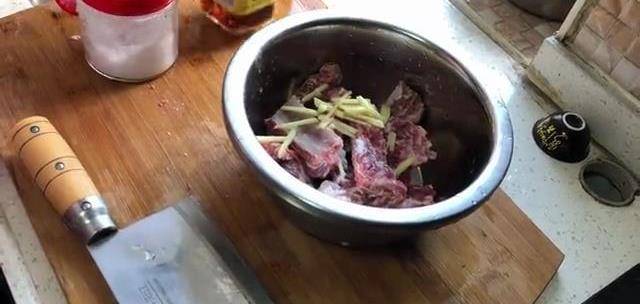 打完花刀後一起放置在盆裡備用。我們切一些薑絲放進去,主要是為瞭提香和去腥,所以不用太多。在再放入適量的鹽和料酒,抓均勻,醃制半小時到四十分鐘。