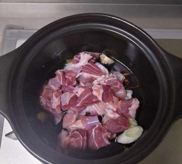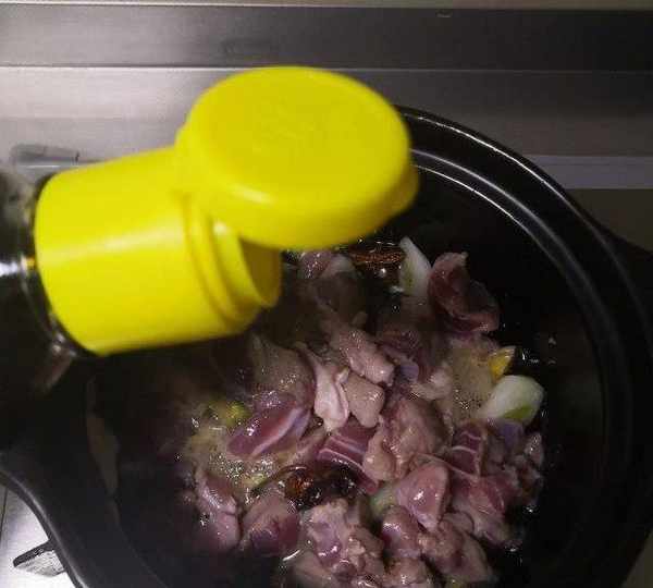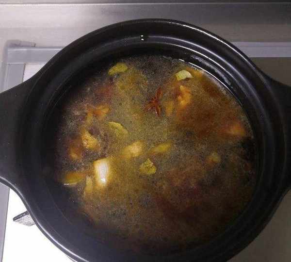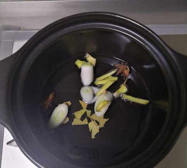 第2步、砂鍋預熱,放入油,溫熱後,放入蔥薑八角和香味,小火炒香。