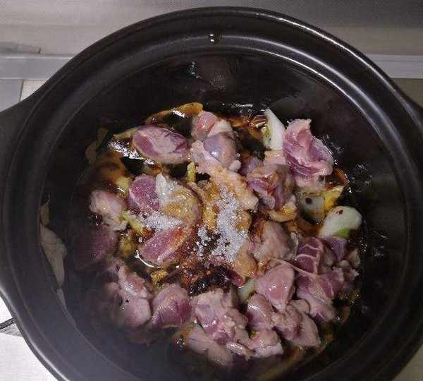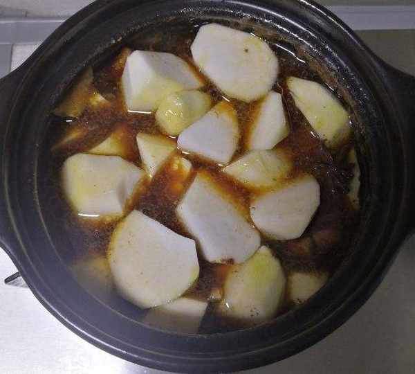 第11步、半小時後放入芋頭,繼續燉煮十五分鐘,芋頭熟透即可,關火放入少量鹽。