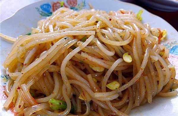 涼拌粉條。將粉條煮熟,加入綠菜、豆芽等配菜,調入生抽、鹽、糖、醋等調味料即可,非常好吃。但粉條不好消化,老人小孩子還是要少吃,防止積食。