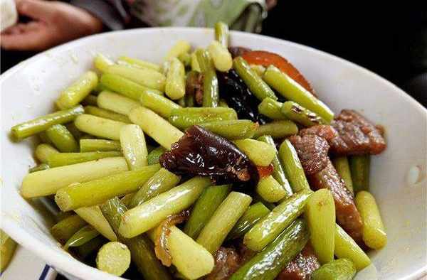 蒜薹炒肉。肉片是姥姥提前炒好的,所以制作時很簡單,先將蒜薹炒熟,然後直接和入炒好的五花肉就好瞭。裡面如果搭配此木耳,就更美味瞭。