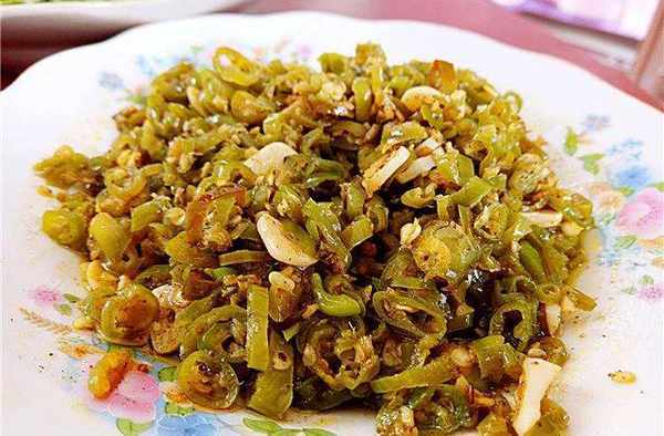 涼拌豆角。將豆角焯熟過涼,再涼拌,清脆爽口,是農傢餐桌上常見的美味。