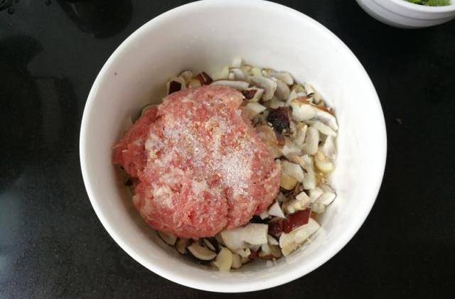 姬松茸洗凈後切碎顆,把肉末放在姬松茸裡,加入調味料,菌菇遇調味料會有水分醃出,正好不用加水在肉裡