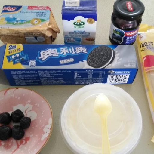第1步、準備食材:黃油,淡奶油,藍莓醬,吉利丁片,奧利奧餅幹,藍莓幹,酸奶。