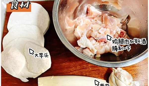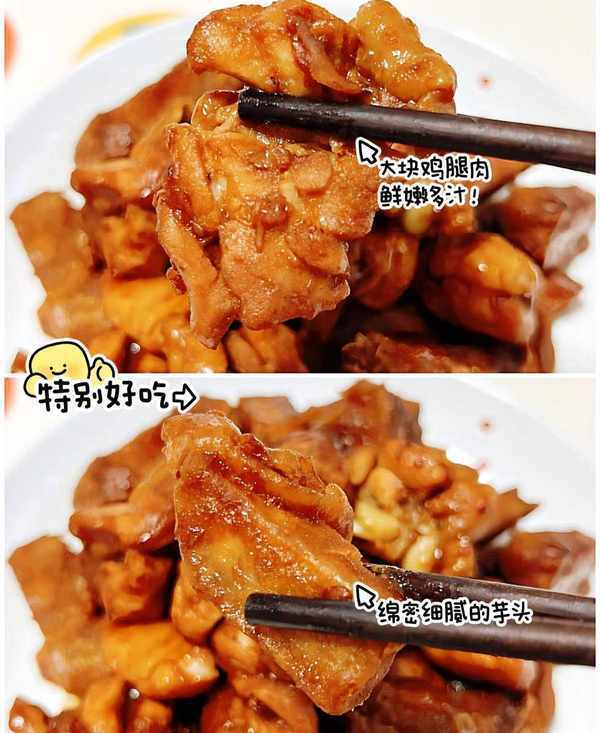 食材:芋頭 300克、雞腿肉 500克、蔥蒜 來多點