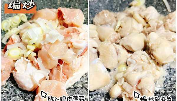 3️⃣ 留下底油,倒入雞肉,先把水分煸炒出來,再放入蔥蒜熗鍋。
