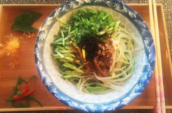 7、把準備好的各種配菜和調料,放入大碗中。黃瓜絲、綠豆芽、香菜、蒜泥、米醋、生抽、香油、芝麻醬、老幹媽辣醬拌均即可。一碗翠綠的涼皮,清涼爽滑,口感柔彈有韌性,獨具風味,太好吃啦!你隻要掌握好火候,按照步驟操作,一定也會吃上自己制作的涼皮!