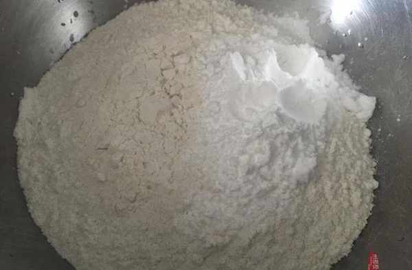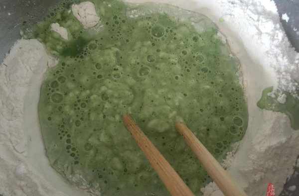 2、面粉、豌豆淀粉、鹽放入盆中,攪拌均勻後,把菠菜汁少量倒入面粉之中,邊倒入邊朝一個方向不斷的攪拌。直到把所有的菠菜汁倒完,盆中無有幹粉狀態。
