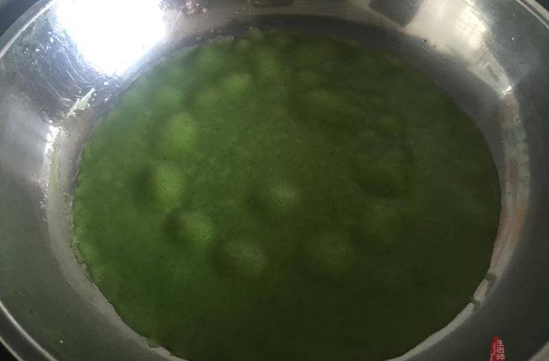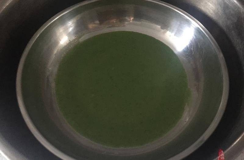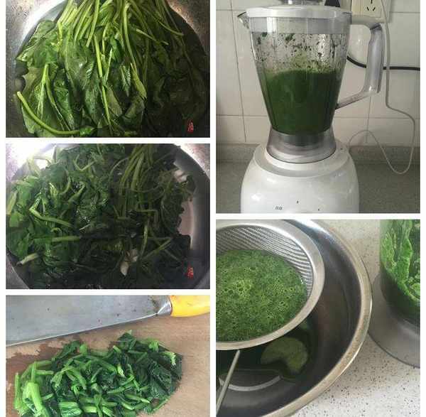1、菠菜擇好,洗凈,用開水煮燙10秒鐘,撈出控幹水分,切成小段,放入料理機中,加放一小碗清水,攪動30秒。過篩取出汁水,用於攪面粉用。
