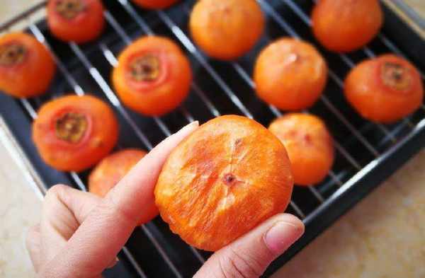 7、一個禮拜後用手捏柿子,感覺果肉不像剛剛晾曬時那麼硬瞭,微微發軟。