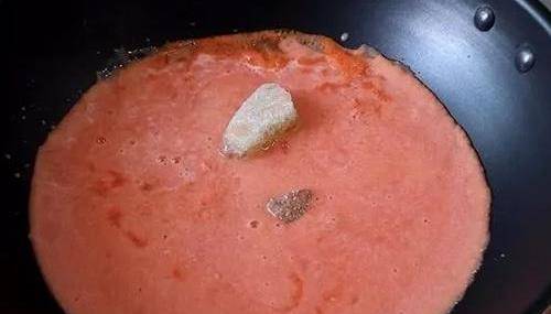 3、等到冰糖全部融化之後,改成小火,慢慢熬。熬到番茄醬變得濃稠,由果泥狀變成濃稠的果醬,再擠入一些檸檬汁,用鏟子攪拌均勻,再熬1—2分鐘,就可以出鍋瞭!