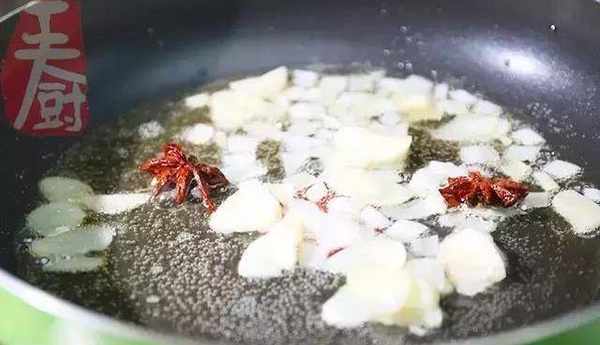 4、炒鍋放少許油加熱,放入蒜片、蔥花、八角炒香。