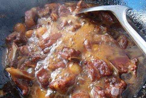 將炸排骨的油倒出,把排骨放進去,倒入調好的糖醋汁、生薑、蒜、八角、桂皮,加水大火煮開,轉小火繼續燜煮20分鐘。