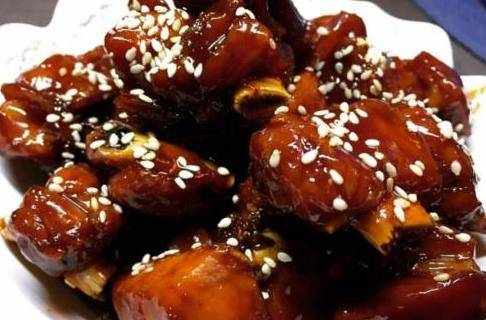 用料:仔排,冰糖,醋,料酒,生抽,老抽,八角,桂皮,生薑,蒜頭,芝麻。