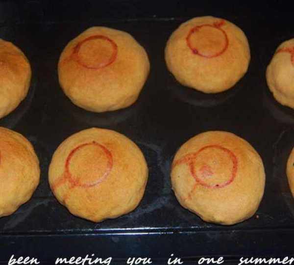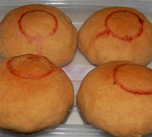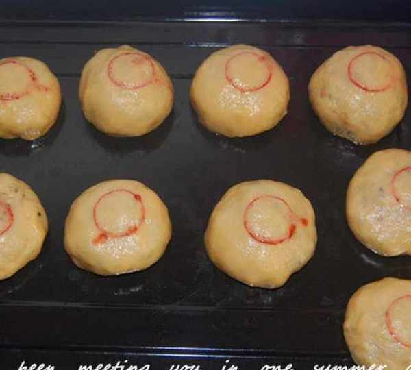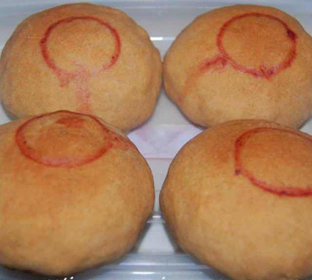 第8步、將合口處放在下面。面上用礦泉水瓶蓋沾少許紅曲水蓋上紅印。放入預熱好的烤箱,200℃,中層,烤25~30分鐘。
