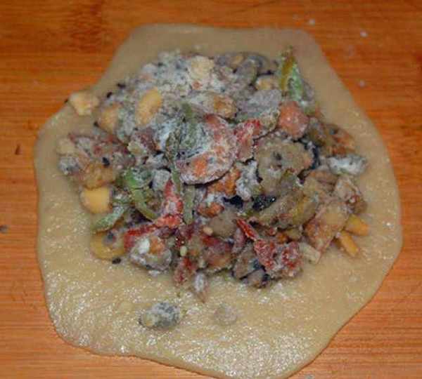 第7步、放好餡料,小心包好。