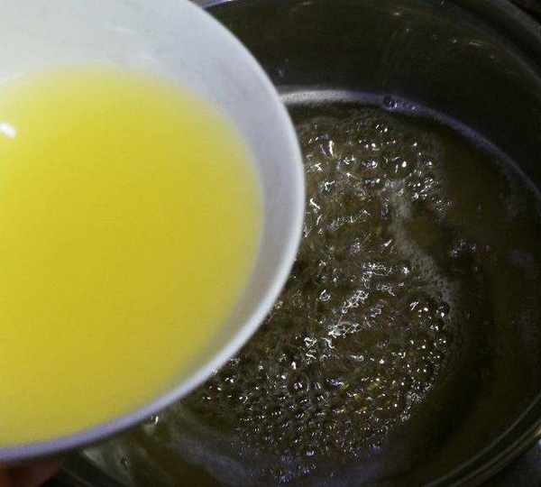第5步、轉微火,同時將檸檬汁倒入糖水中。