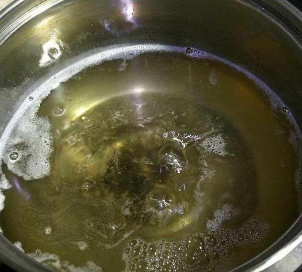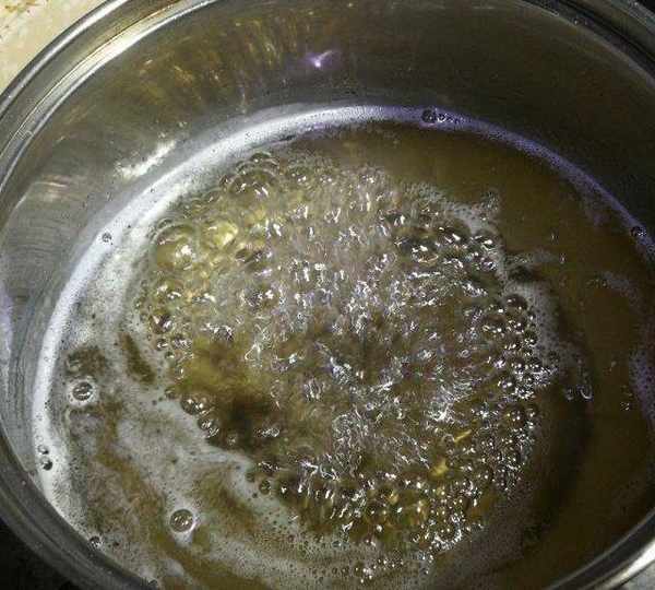 第7步、熬40—50分鐘,糖水呈現琥珀色,並且粘度比蜂蜜略稀,取一小滴稍微冷卻後可用兩根指頭拉出極細的絲時即可關火。