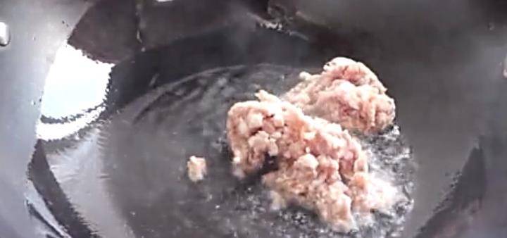 5、鍋中倒入適量的油,油熱之後,把牛肉末放下去炒,加點料酒。