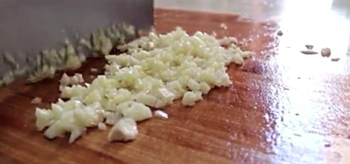 2、多剝一些大蒜,先用刀壓碎,再切成細碎的蒜末。